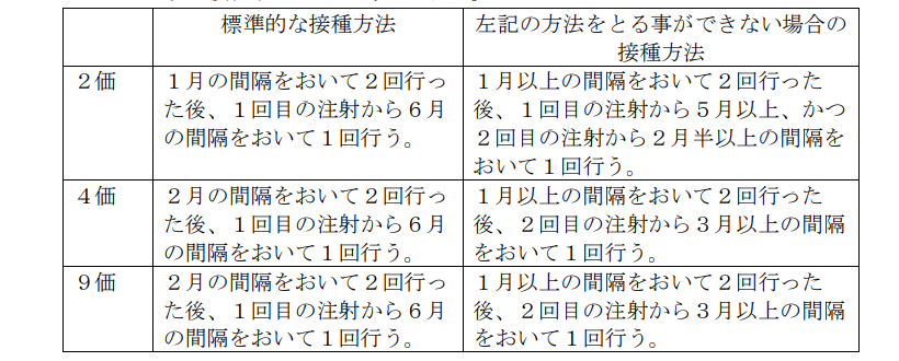 国は標準的な接種方法を推奨していますが、標準的な接種方法ができない場合は希望すれば下記の通りの接種方法でも接種は可能です。接種医と相談して接種をしてください。
