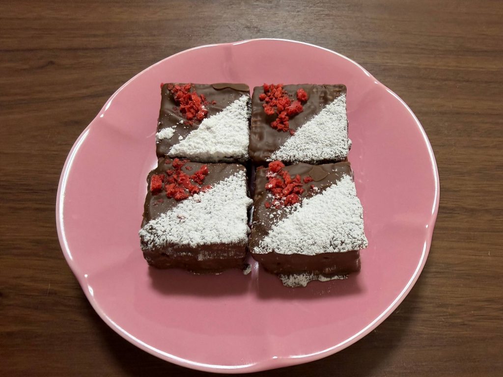 5.フォークを 2 本使いながら全体にチョコをつけて、クッキングシートを敷いたバットや皿の上に並べる。お好みで飾りつける。