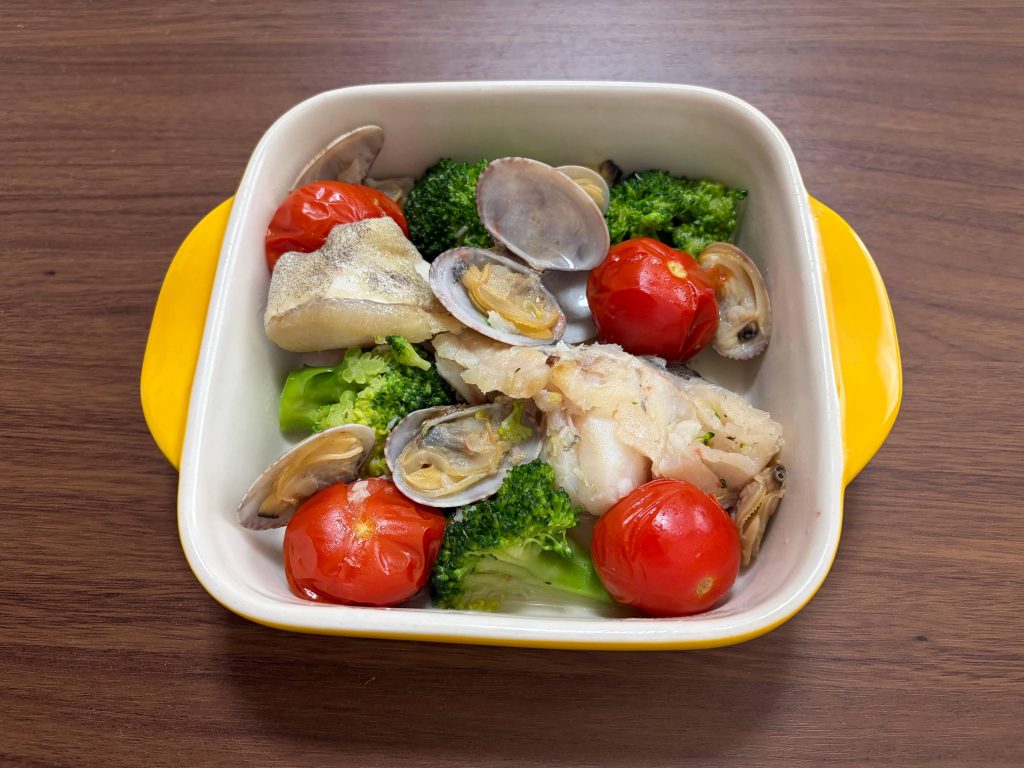 5.アサリが開いたら、火を弱め、ブロッコリーを加え、ブロッコリーが柔らかくなったらミニトマトを加えて、1~ 2 分煮れば完成!